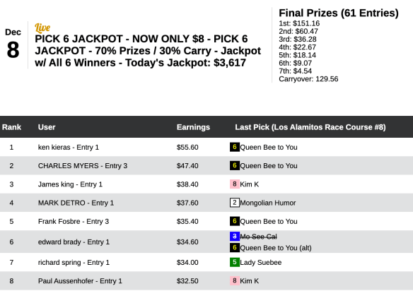 However I was in fourth place going into the last race and no one ahead of me selected Queen Bee to You or Zusha. I need Zusha to win or run second and pay more than $5 dollars. Once again wow second by a nose and paid $8 dollars.