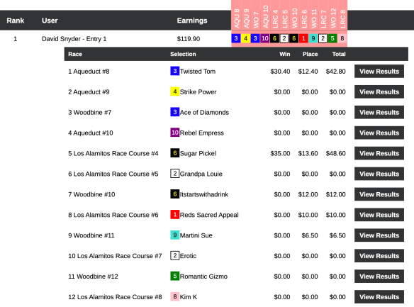 So the reason I played the BCBC contest is I have bet on Twisted Tom his three prior races. When I saw it was the first leg of the contest I had to take a chance. Thought he would be a price and not a play for a lot in a low ratio contest. I will tell you that even after he won I didn’t think I had a chance because I didn’t have the other long shot sugar pickle, my horse ran second.