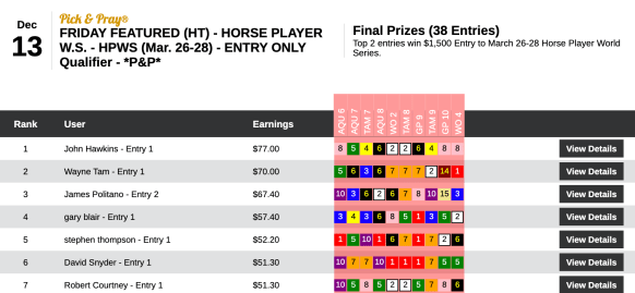 There were also two winners (despite just 39 entries) in our 1-per-20 Pick & Pray qualifier to the Pegasus World Cup Betting Challenge on January 25.