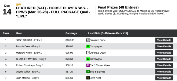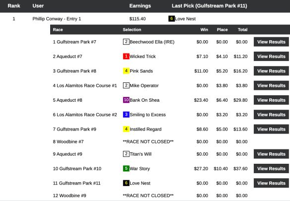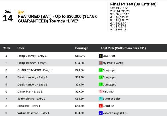 A Louisville, Ky., resident, Conway can tell his grandchildren a contest war story or two thanks in part to War Story, whose 12-1 victory in the Harlan’s Holiday at Gulfstream in the next-to-last tourney race propelled him to victory in our richest event of the weekend, Saturday’s $17,500 Guaranteed game, which closed with a purse of $20,478. Conway’s share of that was $9,215. Here’s how the day unfolded for him: