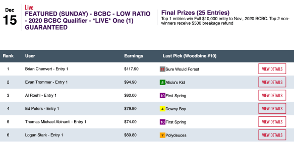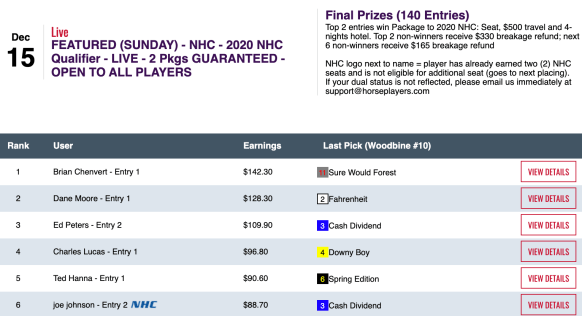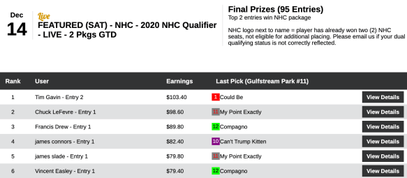 They both had War Story plus three other victors and two runners up to earn NHC spots in Saturday’s live-format qualifier. LeFevre got up for second thanks to War Story ($27.20 to win in the next-to-last contest race) and My Point Exactly ($7.80, $4.60) in the final tourney heat. We know LeFevre hasn’t historically been a fan of live-format tourneys that involve a high-priced winner late in the game. So it was nice to see him profit by such in this one.