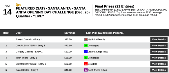 That closing kick added up to 5 wins and 2 places…and a $1,500 entry for Costello in the December 26 Santa Anita Opening Day Challenge.