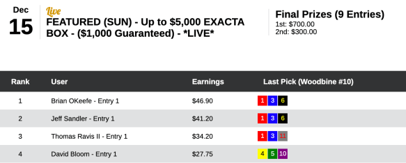 Brian O’Keefe captured the top prize of $700 in this one with a score of just $46.90. He had three winning three-horse exacta boxes. None of them had a $1 payoff any higher than $18.70.