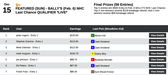 Using the same picks, Derek multi-tabled his way to an NHC seat for just $75. Again, he had the rest of the field in chase mode, and the one to engage in that successfully was James Lafferty, whose three firsts and one second landed him a cut-rate Bally’s Berth in the two-spots-guaranteed competition.