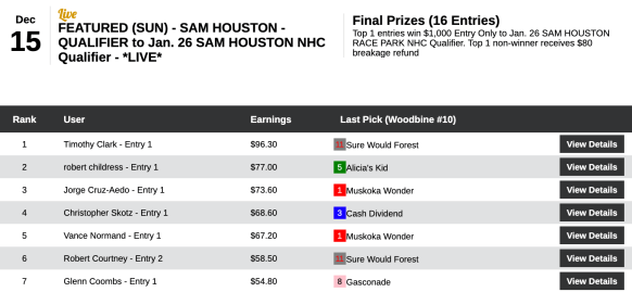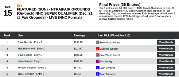 One came in the last chance qualifier to this Saturday’s NTRA/FG NHC Super Qualifier. “The Gambling Actuary” racked up the sound total of four wins and a place to merit his $2,000 package to the Big Easy. Nichols had both 23-1 winner A Freud of Mama in the 8th at Aqueduct and 13-1 Sure Would Forest, the hero of the final tourney race, the 10th at Woodbine.