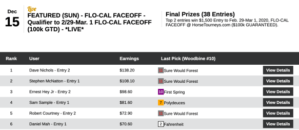 The setting may not be as glamorous as that of New Orleans, but Nichols will be front and center with a paid-up $1,500 entry to the online Faceoff on February 29-March 1. So will runner up Stephen McNatton (3 wins, 2 places), who had Sure Would Forest ($28.30, $10.80) in the tourney finale to send himself to Faceoffland.