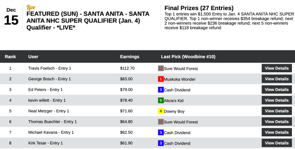 Last weekend, Foelsch earned a $1,500 seat to The Great Race Place’s Opening Day Challenge on December 26. On Sunday, he picked up an identically valued entry to the January 4 NTRA/Santa Anita NHC Challenge. Foelsch had four wins and a place and prevailed by $29.70.
