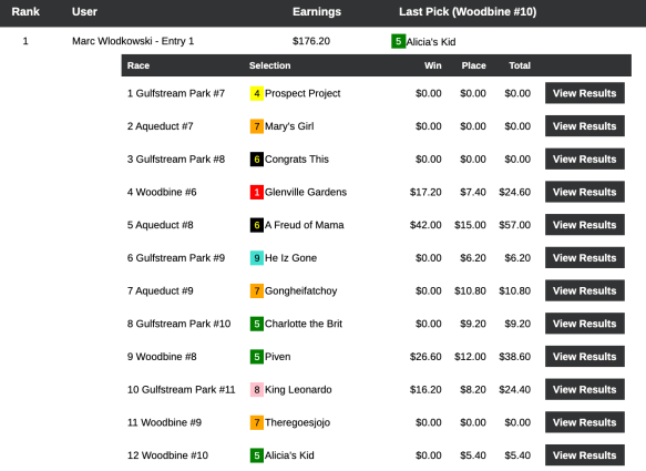 In fact, for Hawkins, Rejected Again was his only winner…but he augmented that hit with three nice place collections to finish on top. On his side of the street, Tam added just one other winner to the win-place total of $37.60 that Rejected Again provided.