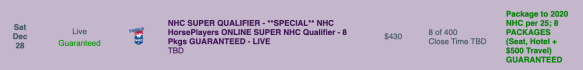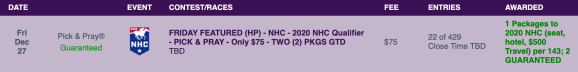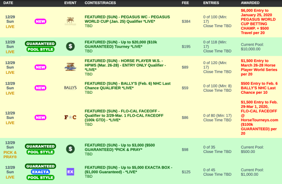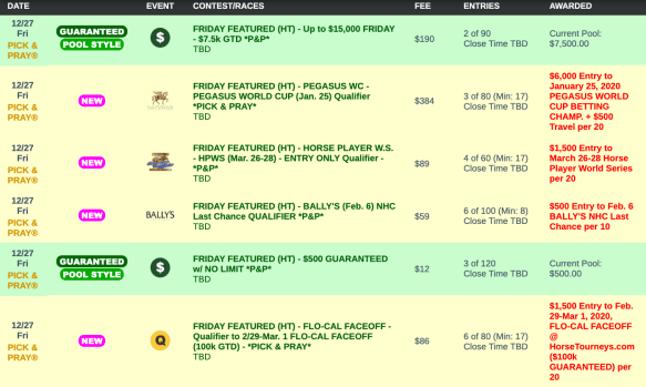 Also on a Friday/Sunday schedule this weekend are qualifiers to the NHC Last Chance Tournament on February 6 at Bally’s Las Vegas. One of every 10 entries will earn a $500 entry. Please note…should you win an entry to this tournament and later earn an actual 2020 NHC seat prior to February 6, you have the option of keeping the entry, trading it in for $500 in HorseTourneys credit or transferring the entry to another player. The deadline for letting us know of your plans is February 1.