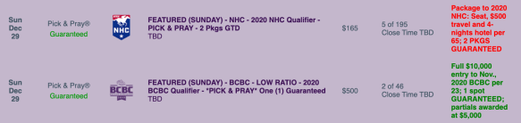 It’s an online NHC Super Qualifier with no fewer than eight seats to the 2020 event guaranteed. The entry fee for this live-format tournament is $430. Theoretically, this works out to a winning ratio of 1-per-25. Though if fewer than 200 sign up, then your winning ratio will be more favorable than that…given the eight-spot guarantee.