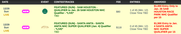 Sunday is your last chance to pick up a $1,500 entry to the NTRA/Santa Anita NHC Super Qualifier on January 4. This play-in carries a 1-per-15 winning ratio and an entry fee of $118.