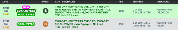 A pair of two-day, live-format tourneys—one a $195 win/place game and the other a low-cost $10 Survivor event—will bridge the changing of the decade. There will be at least 20 races over the course of the two days to decide the respective outcomes.
