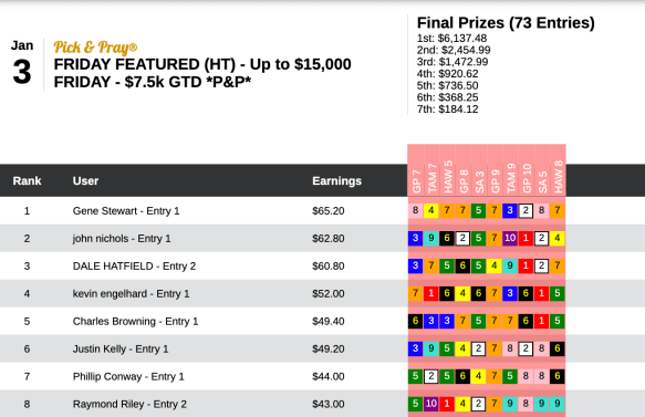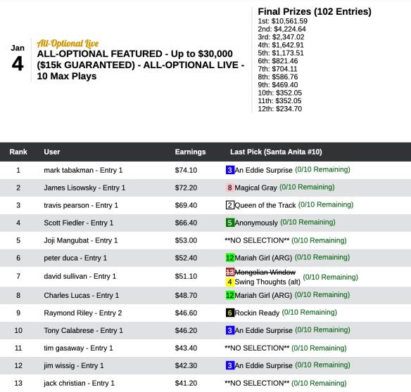 Happily for Mark “Santana” Tabakman, that last jump or two allowed his final race pick, An Eddie Surprise, to get up on the outside for a neck victory that propelled him to a victory over James Lisowsky in our All Optional Live cash game that finished up with a nice pot of $23,470. An Eddie Surprise paid $10.60 to win and $4.40 to place. And that paid Tabakman $10,561. Lisowsky had to settle for $4,224.