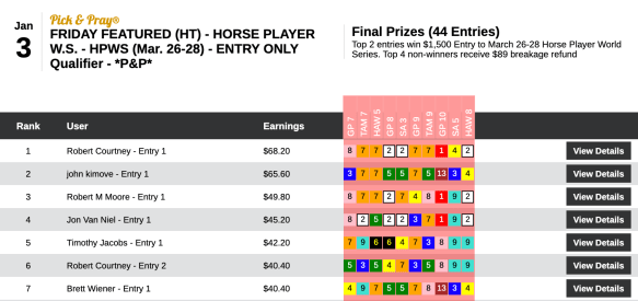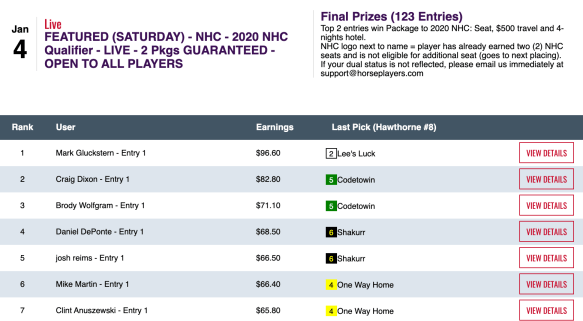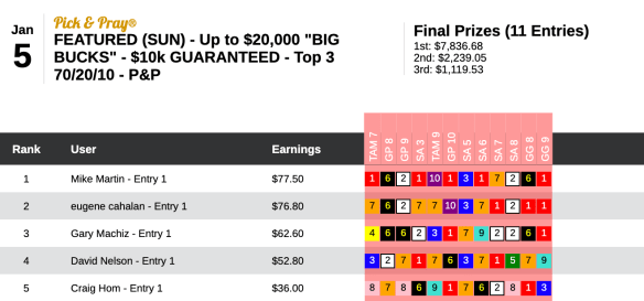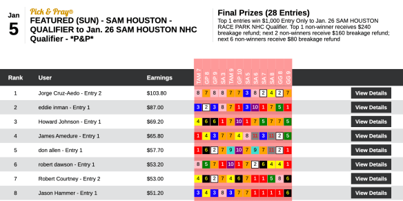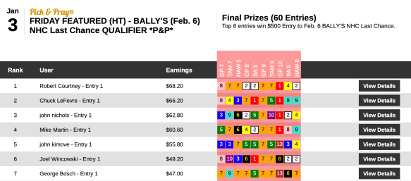 Yep, there’s Robbie Courtney again…this time using the same combination of 6 winners and a place to finish third behind fellow $1,000 entry winners Anthony “ATM” Mattera and John Garofano Jr. Fortunately for Courtney, the Tampa contest this Saturday gives winners the option of a 2020 or a 2021 NHC seat!