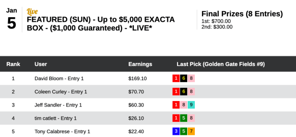 The main beneficiary of the overlay was David Bloom (2 winning exactas). If it had been a fight, this one would have been stopped after Bloom cashed a $144.10 (for a buck) exacta in the 3rd at Santa Anita. Bloom’s first prize was $700.