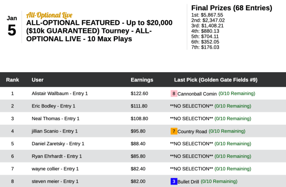 The other two featured events on Saturday were All Optional Live tourneys that required players to make 10 plays from among 25 eligible contest races.