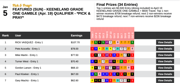 Another 12-race Sunday Pick & Pray was the first qualifier to the April 19 Keeneland Grade One Gamble.