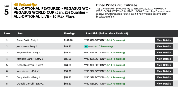 Derek Lapikas had just $60.40, but that was enough to defeat himself (in second place) and the 28 others in Friday’s qualifier to the January 25th Pegasus World Cup Betting Championship.