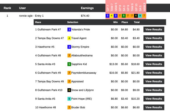 Mike Martin (winner of a $500 NHC Last Chance entry on Friday) prevailed by just 70 cents here in what was a traditional, 12-race Pick & Pray. Both he and runner up Gene Cahalan had final-race winner Bear Chum in this high-end Pick & Pray…so the difference essentially came down to Martin’s $4.40 place collection in the next-to-last race—the 8th at Golden Gate. Martin made $7,836 from a final, overall purse of $11,195.