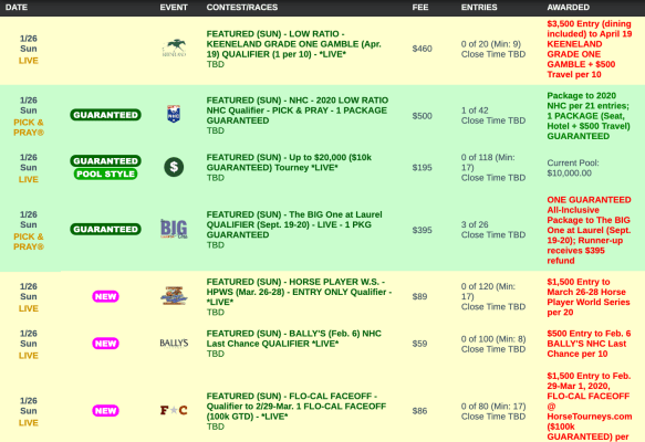 Qualifiers continue, of course, for the NHC Last Chance Tournament at Bally’s Las Vegas on NHC eve, February 6. The winning ratio is 1-per-10 in this $59 Pick & Pray. Again…should you win a $500 entry to this tournament and later earn an actual 2020 NHC seat, you have the option of keeping the entry, trading it in for $500 in HorseTourneys credit or transferring the $500 entry to another player. The deadline for letting us know of your plans is coming up soon…February 1.