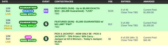 Sunday also offers our $8 Pick 6 Jackpot tourney. Seventy percent of the net pool goes to top finishers via the normal, $2 win/place scoring method, while the other 30% is directed to the Jackpot pool. Go six-for-six on winners and you could take down the Jackpot, which is now up to $4,624. You don’t have to be the only six-of-sixer to win the Jackpot, by the way. If multiple players turn the trick, the jackpot is shared.