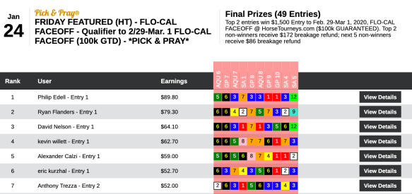 Flanders used his same HPWS selections to defeat all but Philip Edell (5 wins, 2 places) in Friday’s qualifier to the $100,000 Guaranteed Flo-Cal Face-off. Edell cashed in each of the final four races to get to the top spot. But there were enough entries to award a pair of $1,500 Flo-Cal berths, so second wound up being as good as first for Flanders.