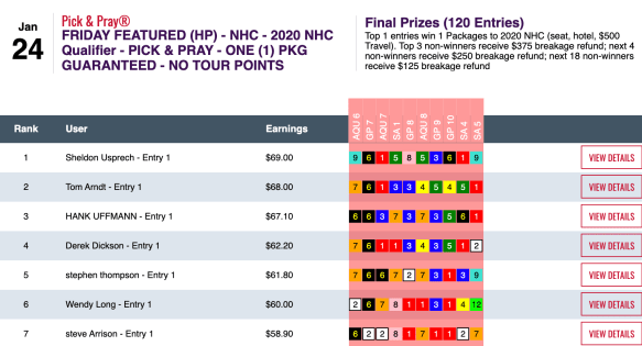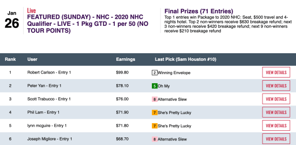 Schuler certainly didn’t play like a “maiden” in Saturday’s NHC qualifier restricted to those yet to win a 2020 seat. He picked seven winners—including six in a row at one point—plus two runners up. Here’s how his day went: