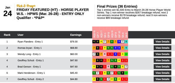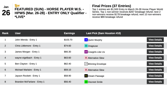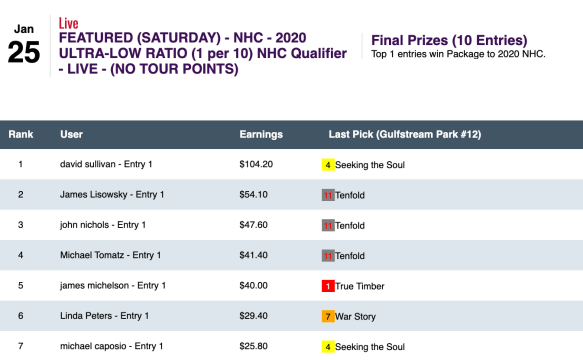 Scores were, unsurprisingly, a lot lower in the other NHC qualifier at HorsePlayers on Saturday. That’s because there were only 10 entries in it—an Ultra Low Ratio qualifier.