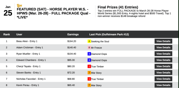 Qualifying continues for the NHC, of course…and keep an eye out for upcoming new qualifiers to the Santa Anita February Challenge (Feb. 22) and the TSG Ultimate Betting Challenge (March 7). Sounds like it should be challenging!