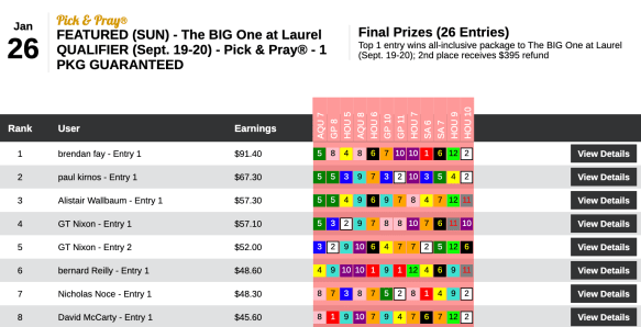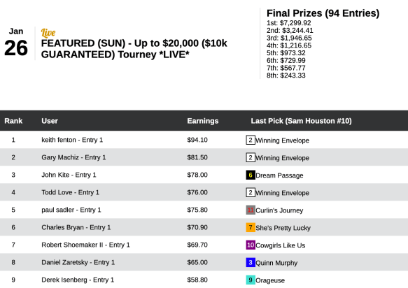 It was John Merola who picked up the $1,500 entry for his 7 winners and 1 runner up. Merola was the only player in a Sunday featured event to crack triple figures. Here’s a look at his scoresheet (which contained six of the day’s first eight winners):