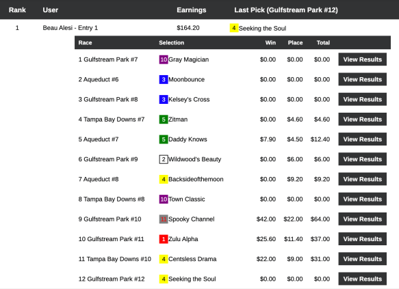 Nevertheless, David Sullivan left no doubt as to who was best in this one as he nearly doubled the score of his closest pursuer. Sullivan had just two winners (plus a place), but they were really good ones…cap horse Spooky Channel and Tampa 10-1 shot Centsless Drama.