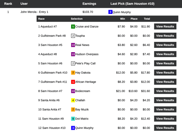 He won this event for the second straight week. And for the second consecutive week, he reeled in a big one that did most of his damage. Last week, he did almost all of his scoring with a $174.40 (for a dollar) exacta that wound up tripling up his opponents. On Sunday, he doubled up his foes, thanks largely to a $147.10 windfall in the 7th at Sam Houston. This week, Trepinski made $1,071 (from a final pot of $1,531) to go with the $929 he earned the previous Sunday.