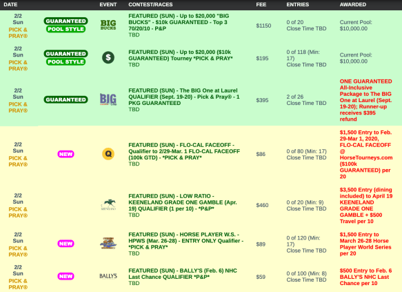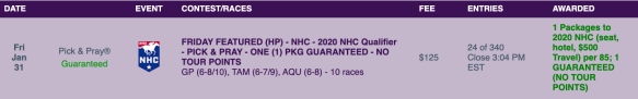 The “Last HorseTourneys Chance” to qualify for the 2020 NHC comes via a “regular”, $165 Pick & Pray. One seat is guaranteed.