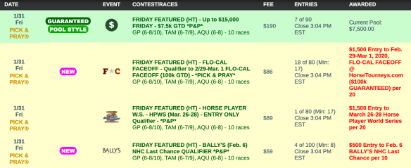 At HorsePlayers, the highlight of the Friday schedule is the first of five weekend qualifiers to the 2020 NHC. (These are your last chances to qualify online for the big dance…now just eight days away.)
