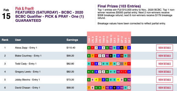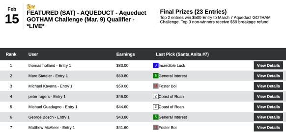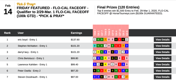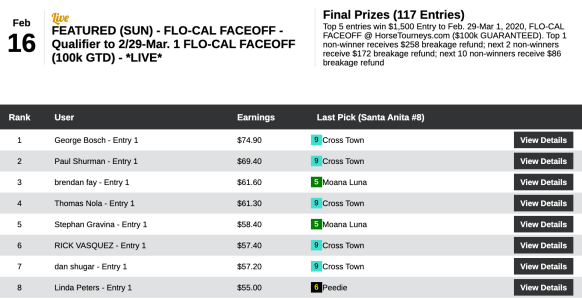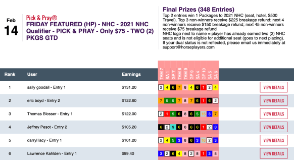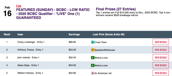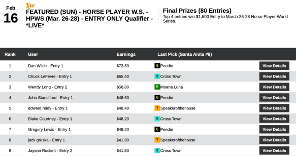 They each picked up $1,500 entries in Sunday’s Horse Player World Series qualifier.