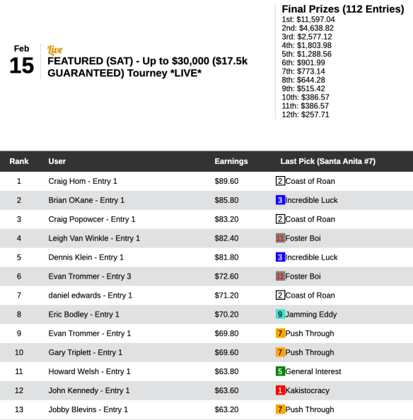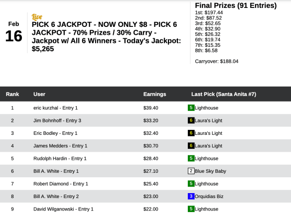 Blake Courtney had the day’s highest priced winner (Cross Town—$10.60, $5.20) and it came in the final race (the 8th at Santa Anita). That “bomb” plus two other short-priced wins and four places got Courtney the grand prize of $7,000 in Sunday’s $10,000 Guaranteed Big Bucks Pick & Pray.