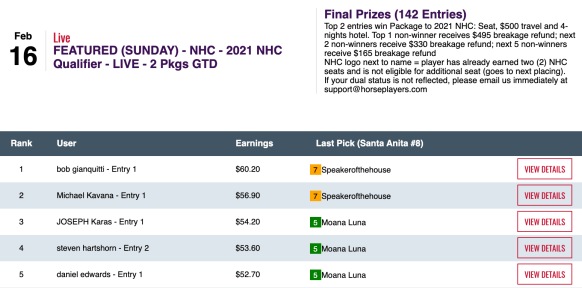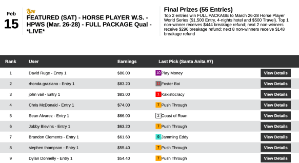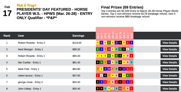 In fact, Monday’s Horse Player World Series qualifier saw Saturday Keeneland package winner Robert Rosette pick up two $1,500 entries to the “March Major” at The Orleans. And Saturday Santa Anita February Challenge seat winner Neal Metzger got the other available HPWS spot for running second.