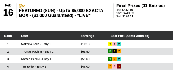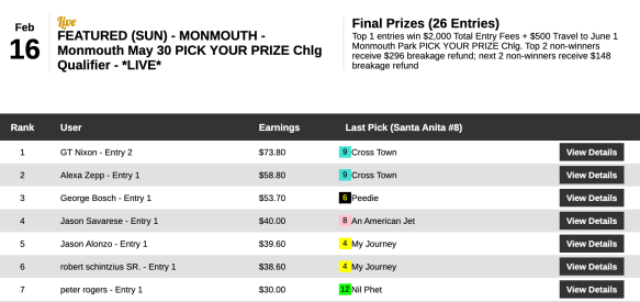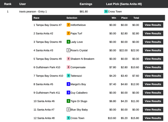 Pearson added $22.00-to-place returner Rose’s Crystal in the 3rd at Santa Anita to Cross Town and five other cashes to secure the day’s “regular” $10,000 Guaranteed cash tourney. It closed with a pot of $17,602—$7,921 of which went to Pearson, whose score of $81.80 was the day’s best. Here’s a look at how his day went: