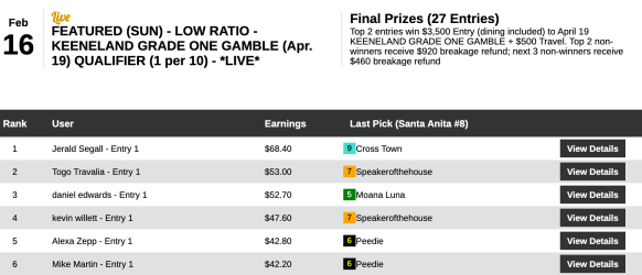 There were enough entries in Sunday’s Keeneland Grade One Gamble Low Ratio qualifier to award a pair of $4,000 packages.