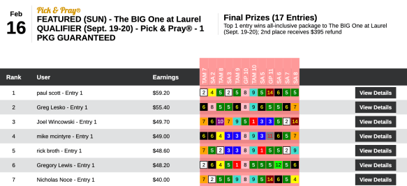 The big horse for Rosette on Monday was 75-1 Gulfstream Race 8 winner Scarto. Andrew Walker used that same South Florida capper to great success in Monday’s $15,000 Guaranteed No Limit Pick & Pray.