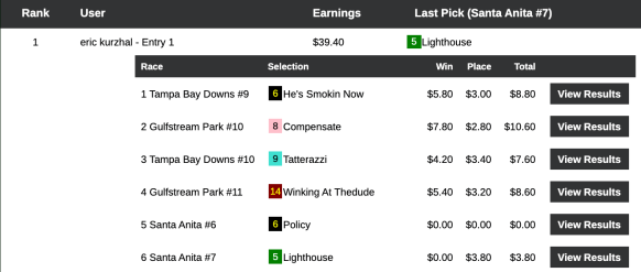 Fay nailed the first three winners en route to a 6-win, 1-place day—good for a $3,500 package to the Gulfstream/Santa Anita/Xpressbet competition.