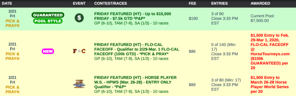 Time is drawing even shorter to qualify for the February 29-March 1 Flo-Cal Faceoff. That’s our $100,000 Guaranteed online event featuring full-card action both days from Gulfstream and Santa Anita. When next weekend rolls around, it will cost you $1,500 to buy in to the Faceoff…but you can win a spot in it for $86 in Friday’s Pick & Pray qualifier.