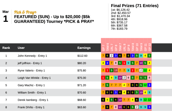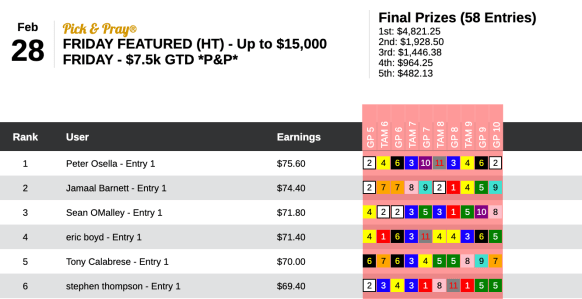 Another $32.00 margin of victory was seen in Sunday’s $5,000 Guaranteed Pick & Pray.