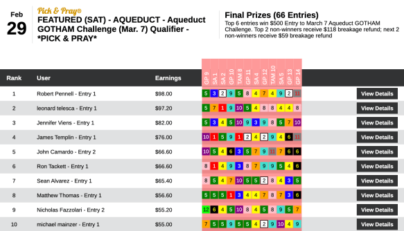 Congratulations to Robert Pennell, Leonard “Hubble” Telesca, Jennifer Viens, Jim Templin, John Camardo and Ron Tackett…each of whom will be heading to Ozone Park (or NYRA Bets) on Saturday with paid-up $500 entries.