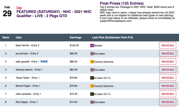 The marquee tourney at HorsePlayers on Sunday was a Breeders’ Cup Betting Challenge Low Ratio Pick & Pray.