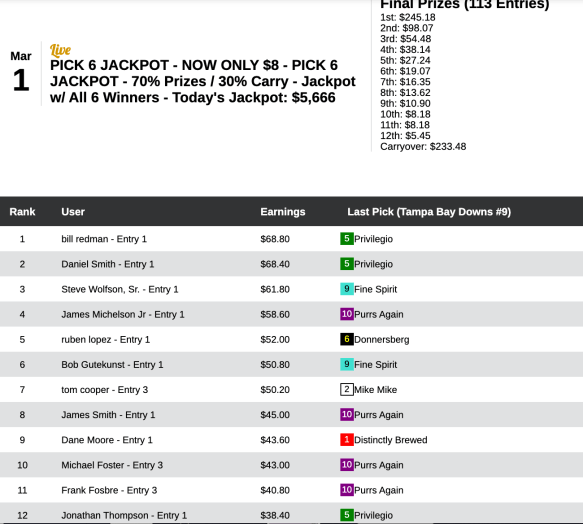Top honors in Sunday’s $8 Pick 6 Jackpot tourney went to Bill “America’s Favorite Chew” Redman.