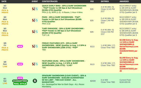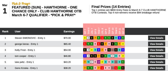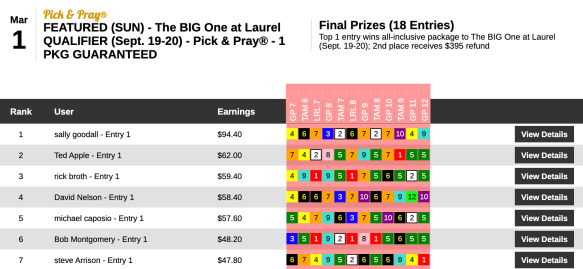 We had four winners on Sunday of $1,500 entries to the March 26-28 Horse Player World Series.