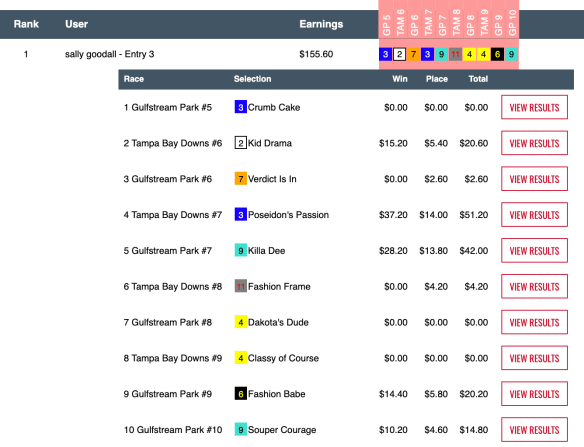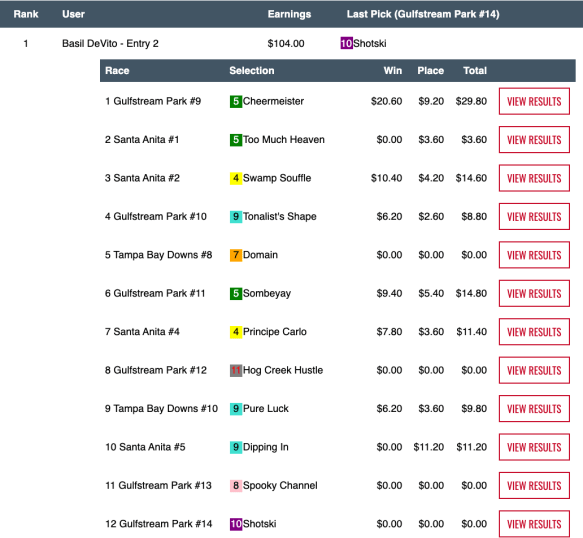 There were two winners here as Paul Cush (6 winners) and Gary “Macho Man” Machiz each walked away with $3,500 packages that can be redeemed either at Gulfstream, Santa Anita or xpressbet.com this Saturday. Good luck!