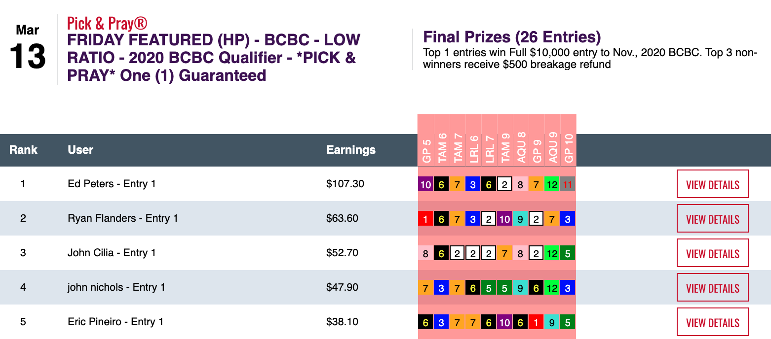 The Pelham, N.H., bread distributor saw his 2 wins and 3 places rise to a score of $107.30—good for a victory (by more than $43.00) in Friday’s Breeders’ Cup Betting Challenge qualifier at HorsePlayers. Peters, it should probably be noted, pulled in $275,000 while finishing third in the 2017 BCBC.