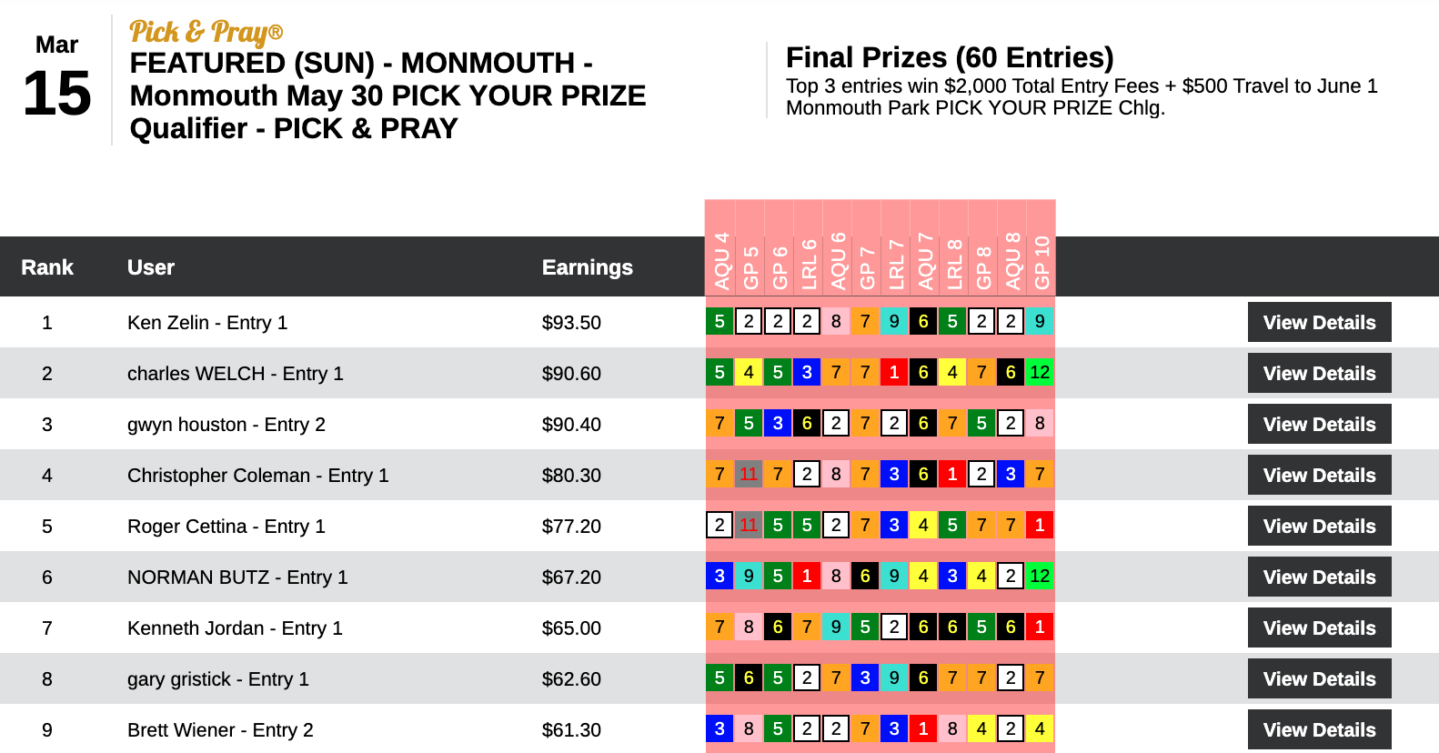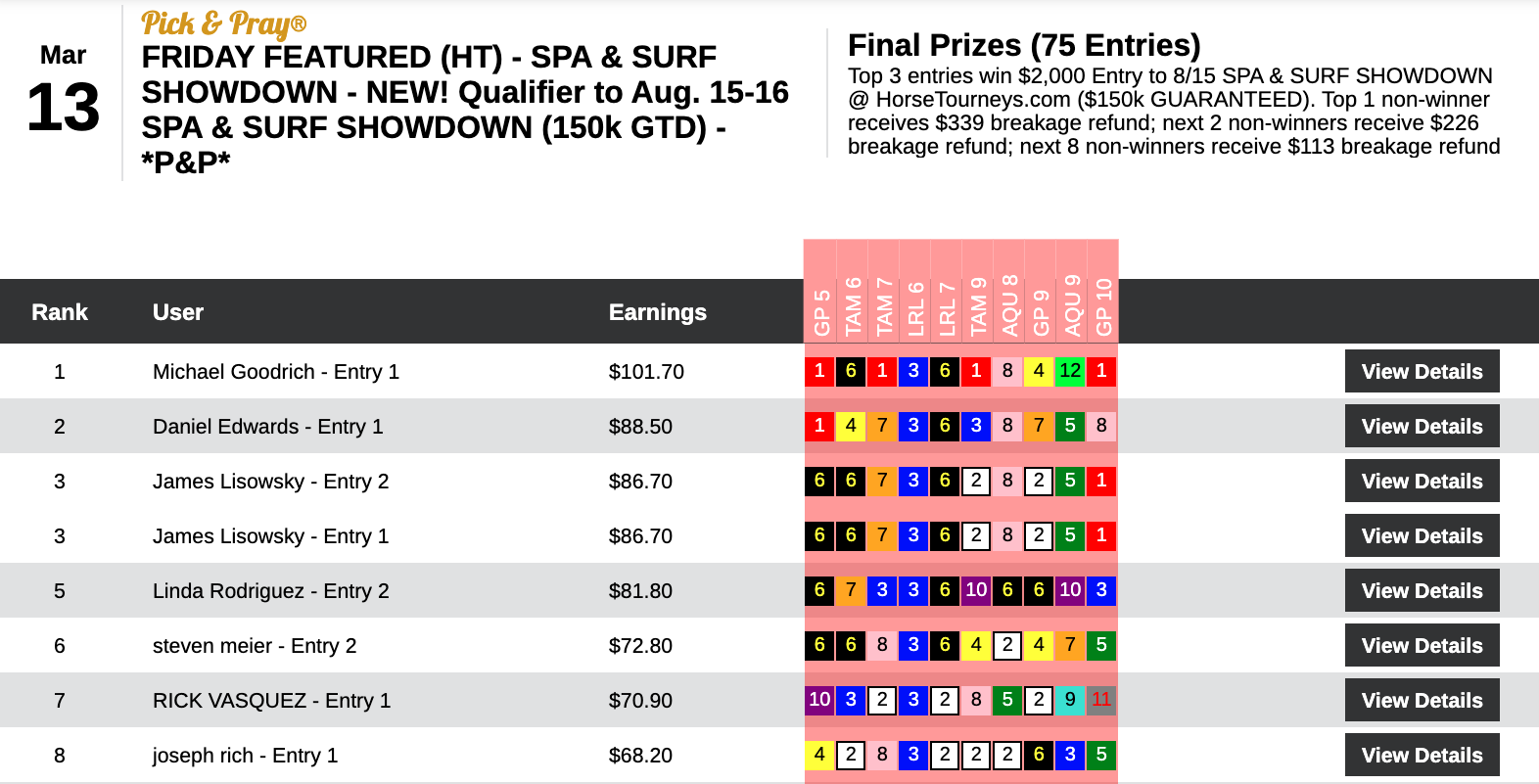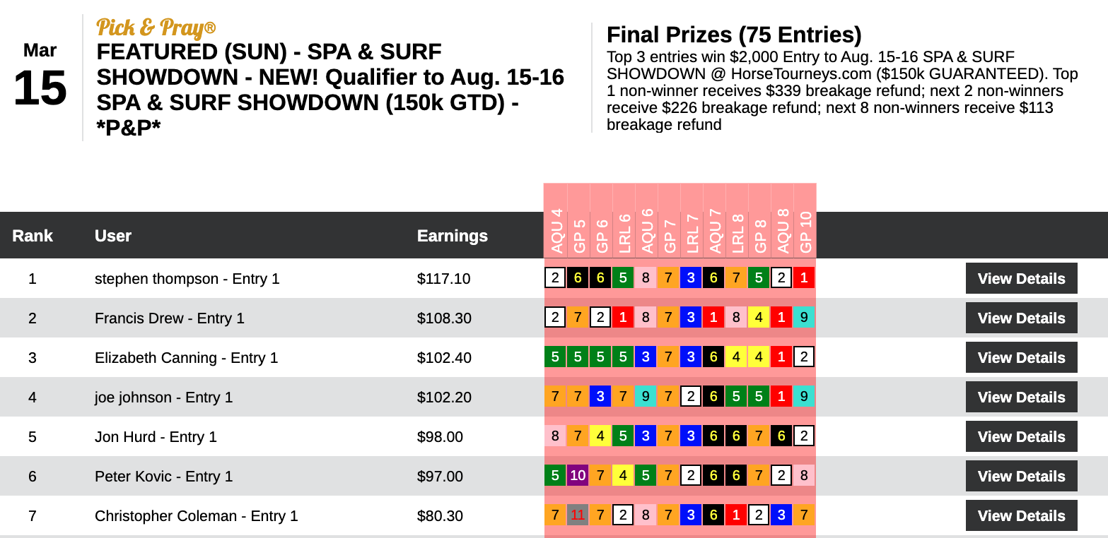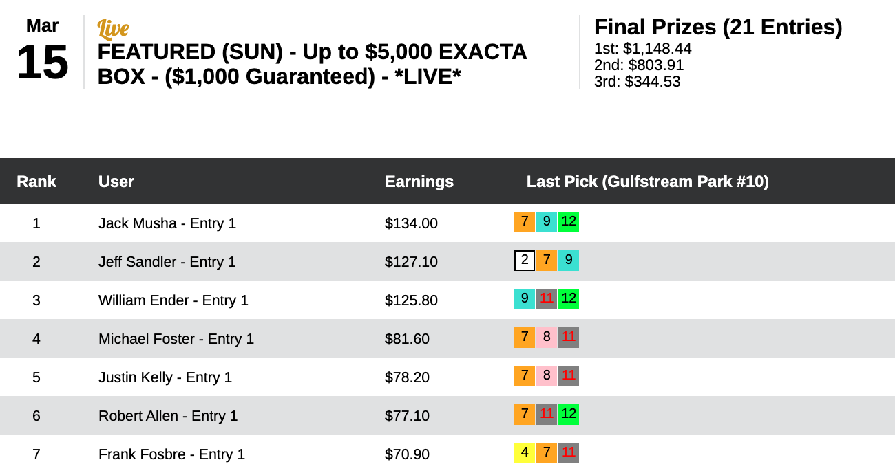 In our $1,000 Guaranteed Exacta tourney, Jack Musha connected on an amazing 7 winning gimmicks from just 12 races.
